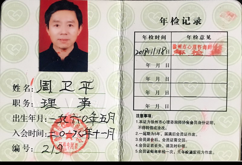 周卫平,男,汉族,1960年5月出生,中国社会科学院研究生院硕士研究生课程班经济管理专业毕业。曾经在部队服役8年,在国有大型企业担任领导职务13年,担任养老服务机构理事长6年,现为徐州市云龙区养老服务业协会法人代表。国家二级心理咨询师、国家二级公共营养师、高级康复治疗师、中级亲子沟通培训师、社会工作者(二级)。2015年、2016年、2017年分别受邀参加在北京人民大会堂举办的第一届、第二届中国养老服务高层论坛和健康中国建设学术研讨会。2017年协助《彭城晚报》开辟了“助老热线”和“我的退休规划”咨询热线。2018年组织开展了百名“独居老人近身陪伴”精神关爱主题活动。在老年心理学、健康养生以及人际关系和沟通方面有一定的研究,尤其是在安宁护理老人的心理疏导方面有较丰富的实践经验。