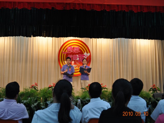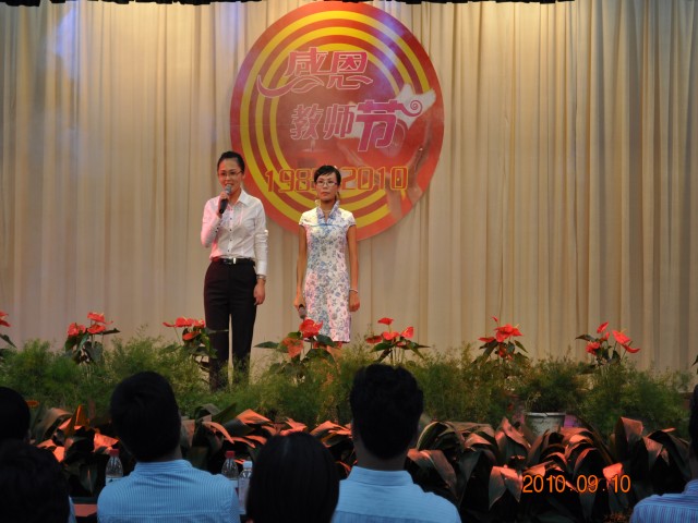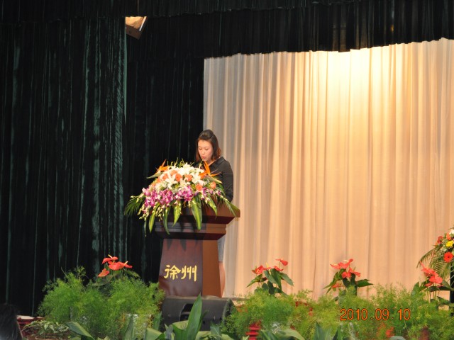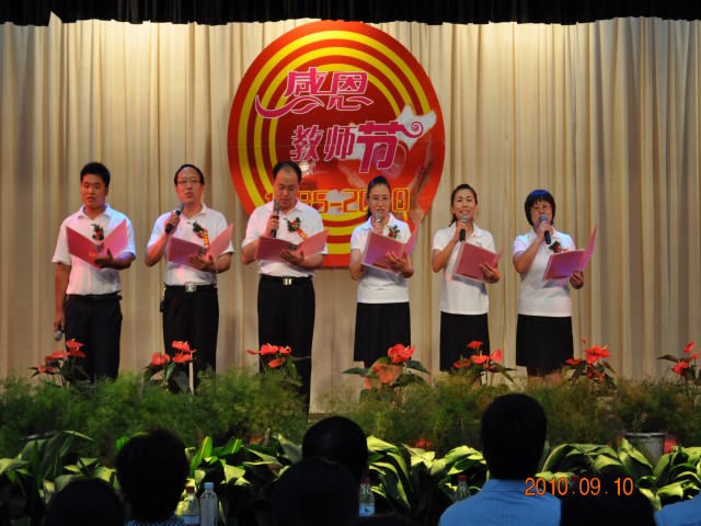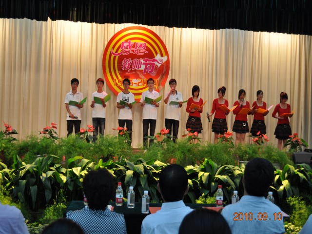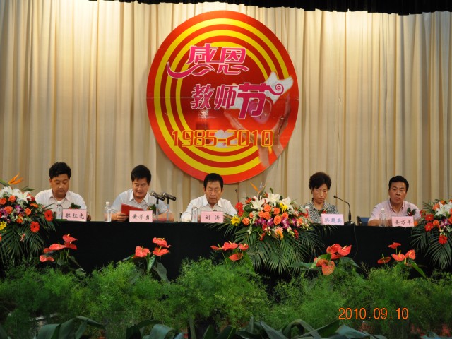 大会由党委副书记韩超英同志主持。会议在雄壮的国歌声中拉开序幕。孔杨老师宣读了校党委、行政致老师们的一封信。2010级新生代表向全体老师献花。新生代表缪灿灿、教师代表宋娟先后发言。副校长黄学勇同志宣读了教师节表彰决定,校领导为获得表彰的先进个人颁发了证书。